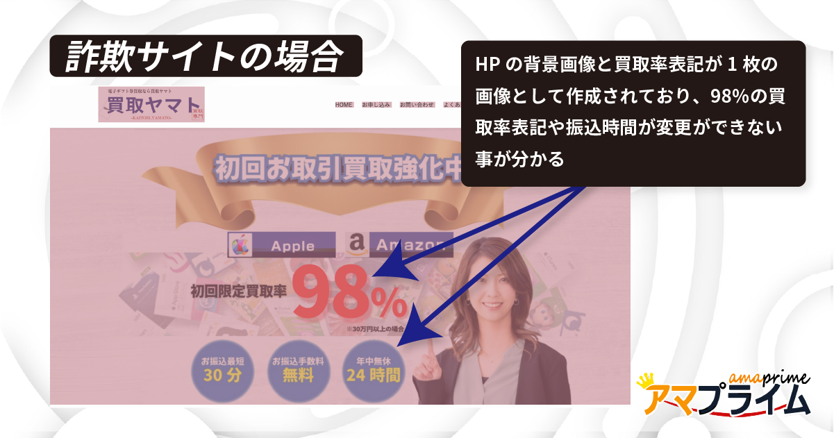 上記の理由から常に95%以上の買取率を謳っている買取サイトは高額な買取率で買取申込を促し、Appleギフトカードを騙し取る詐欺サイトの可能性が非常に高いです。