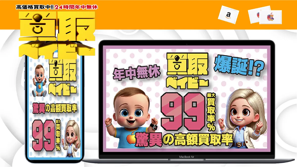 買取ベイビー | 95点 | 4.7 買取ベイビーの口コミを見る | 99.0% | 93.0% | 99% | 平均20分 | 無料〜129円 | 1,000円〜上限なし | 1回の申込辺り40枚まで | 24時間営業 ※電話受付:9時〜22時 | 15種類 | 有 | ・LINE申込で買取率1%UP ・メガボーナスクーポン使用で買取率1%UP |