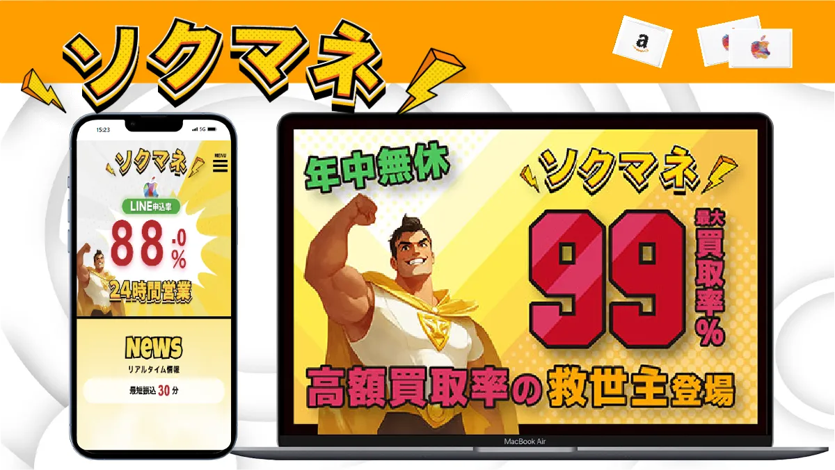 ソクマネ | 83点 | 4.7 ソクマネの口コミを見る | 95.0% | 93.0% | 99% | 平均40分 | 無料〜129円 | 1,000円〜上限なし | 1回の申込辺り40枚まで | 24時間営業 ※電話受付:9時〜22時 | 1種類 | 有 | ・LINE申込で買取率1%UP ・メガボーナスクーポン使用で買取率1%UP |